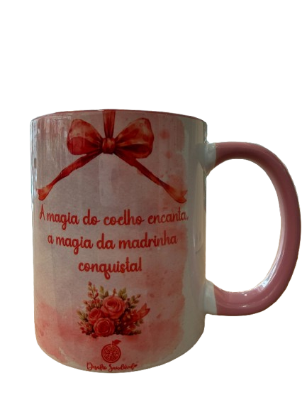 Caneca A magia do coelho encanta, a magia da madrinha conquista! - Coleção Páscoa.