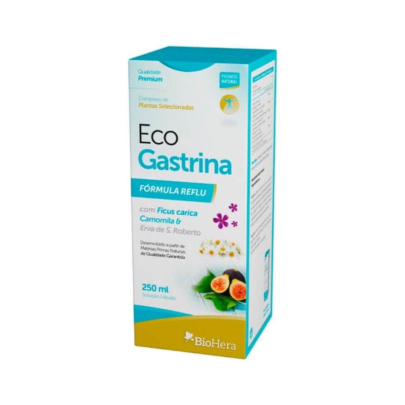 Eco gastrina é um suplemento desenvolvido a partir de matérias primas naturais, de qualidade garantida. Com figueira, rica em fibras, contribuindo para a regularização do trânsito intestinal. A camomila tem efeito calmante do aparelho digestivo. A erva de São Roberto é uma planta com propriedades benéficas para o estomâgo, prevenindo e tratando úlceras gástricas e mitigando sintoms associados à azia.