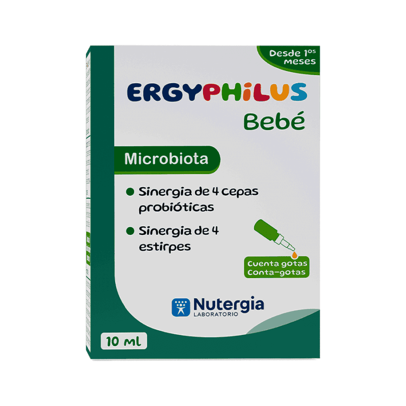ERGYPHILUS Bebé é uma sinergia única de 4 estirpes de bifidobactérias vivificáveis e de lactobacilos cientificamente selecionados pelas suas propriedades, não microencapsuladas e fisiologicamente presentes no leite materno. A vitamina D3 completa a fórmula e contribui para o funcionamento normal do sistema imunitário das crianças. É formulado sem alergénios ou aditivos. O formato líquido pronto a usar com conta-gotas facilita a ingestão desde a mais tenra idade. A vitamina D3 completa esta fórmula e contribui para o normal funcionamento do sistema imunitário das crianças.