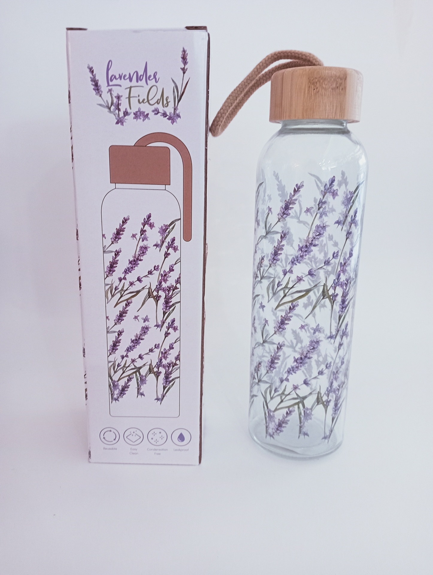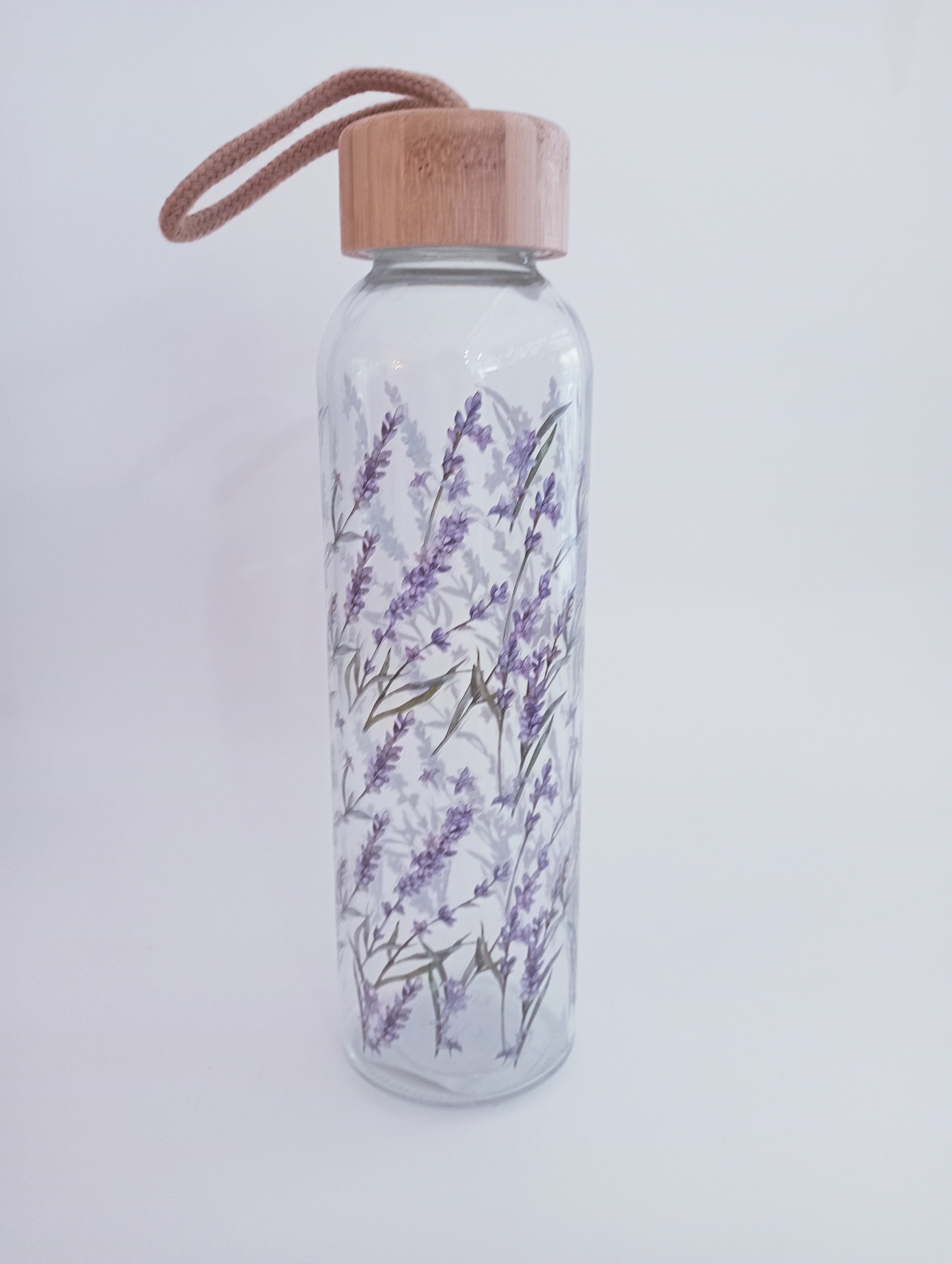 Garrafa de Vidro com Tampa de Bambu Lavanda