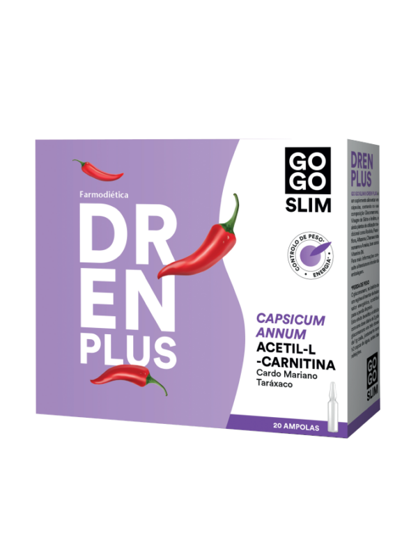 Go Go Slim Dren Plus é um suplemento alimentar em ampolas, cotendo na sua composição Acetil-L-Carnitina, Plantas como Cardo Mariano, Capsicum annuum e Cavalinha, e ainda Vitamina C e Zinco.
