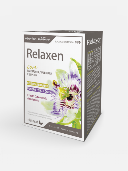 Relaxen é um suplemento especialmente formulado para o tratamento da ansiedade. A passiflora e a valeriana são calmantes naturais que ajudam a manter a calma perante situações de maior stress. Podendo também ser um bom suporte para a regularização do sono.